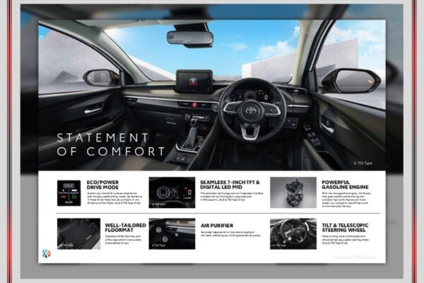 Mobil berkapasitas lima orang ini menyematkan fitur-fitur canggih yang mudah dioperasikan. Pertama, Powerful yet elegant dashboard Design dengan waena black. Setir kemudinya sudah dibekali dengan Steering Switch berlapis kulit premium (tipe G). Pada tipe G, terdapat pula pengaturan AC otomatis dengan tampilan digital.